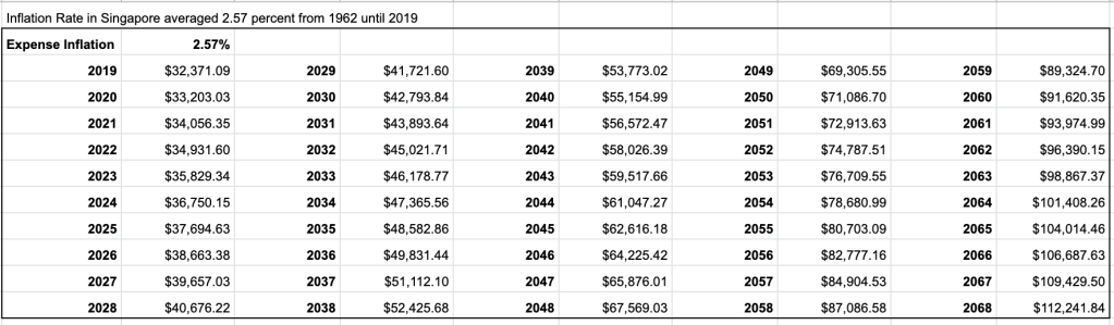 Of course, the inflation rate we are using is of the higher end – 2.57%. If we were to use 2019’s inflation rate of 1.4%, the numbers will look way lower. However, there are studies that say that experts expects inflation to go up to 3.2% in the coming years, giving us reason to be alarmed and to use the historical 60 years inflation average.