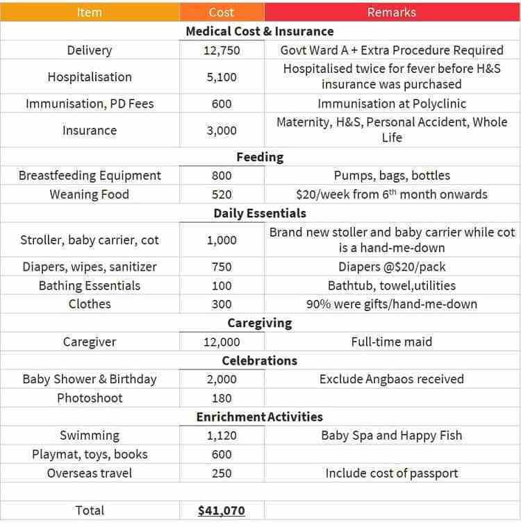 S$41,000 seems like a lot of money and hence, we decided to do some budgeting on our side. To do that, we compare Heartland Boy’s figure as well as SG Budget Babe’s figure to come out with a median amount of what we need to budget for our first child.