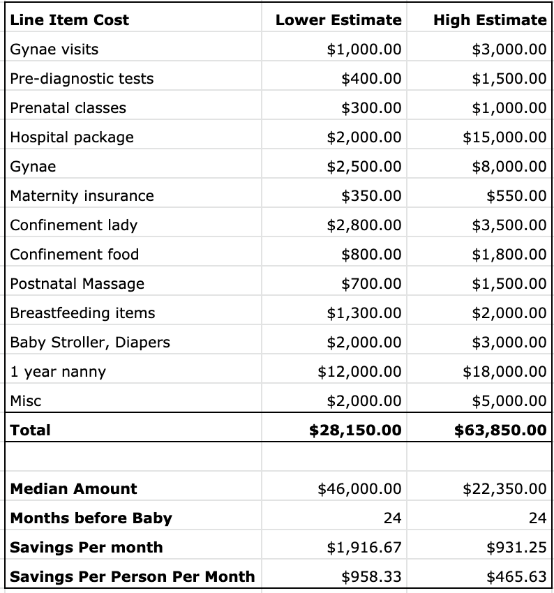 So, if we were to remove some optional items from the lower estimate figures (prenatal classes, confinement food, misc items), the amount that we need to save up turns out to be S$22,350, a much more palatable budget.