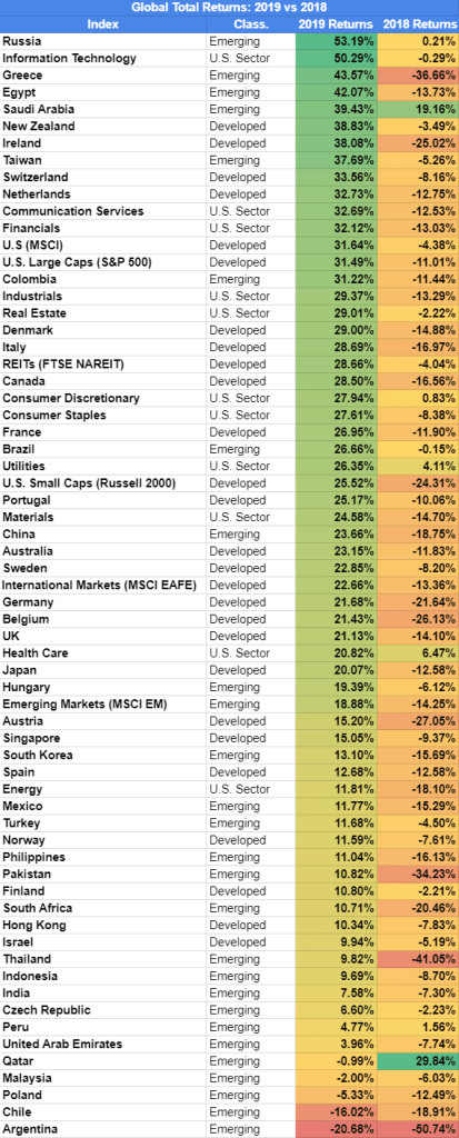 The first compares the 2019 global market returns, ranked best to worst, with its 2018 return as a comparison. The second is global total returns for the 2010s decade.