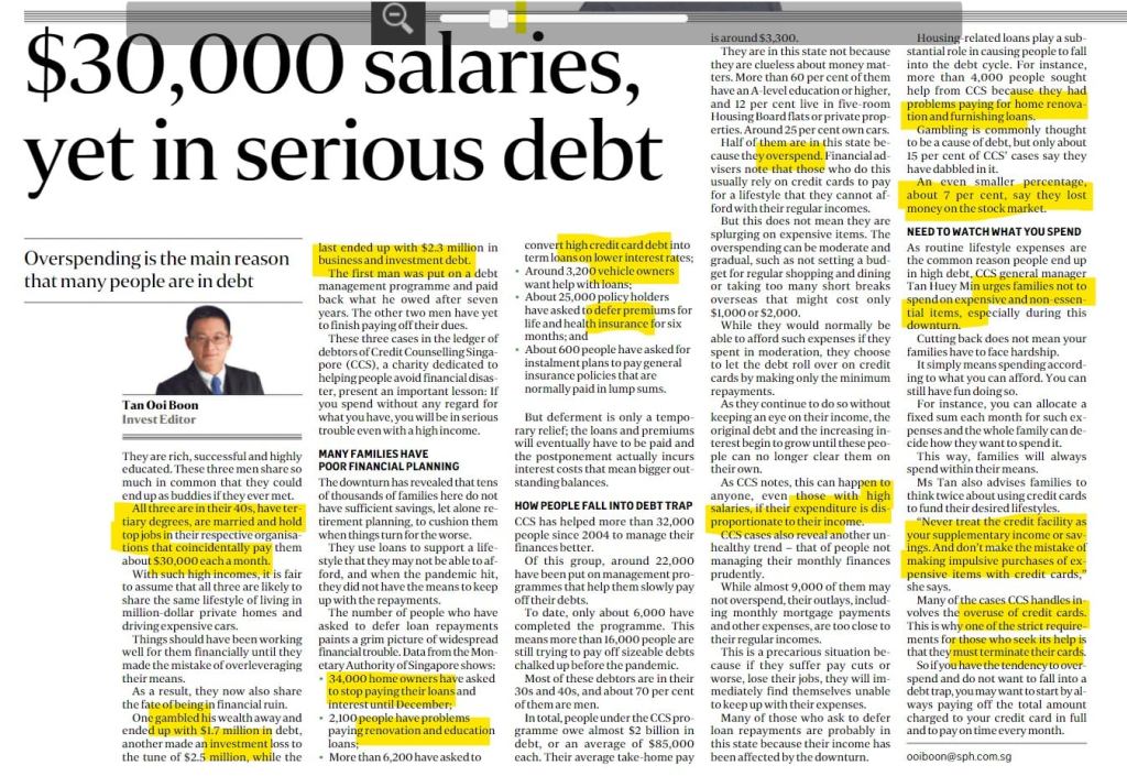 The article points our some bad decisions by some high earners in Singapore, and ended up in debt despite having five figures income (Mr and Mrs Budget are earning 4 figures income).