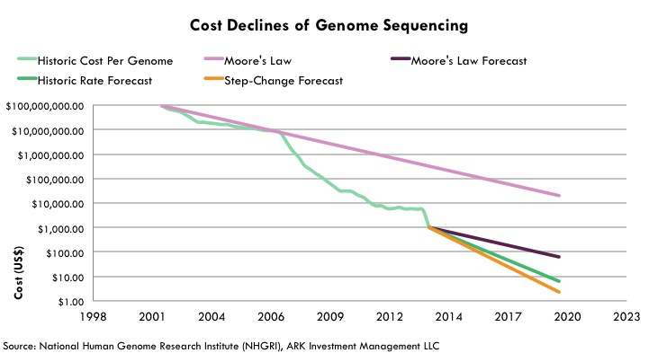 For Ark Invest, the are investing in disruptive technologies, and they have a 5 – 10 years time frame. The specific areas that Ark thinks will see a huge hockey stick J curve due to the effect of compounding returns (she calls it the Amazon effect) is in the genomic space.
