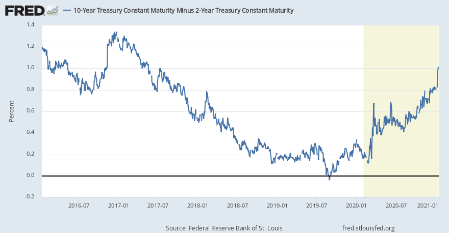 Market watchers often track the yield curve as an early indication of where the market is headed. Earlier this week too, ARK Invest’s Cathie raised a note about the rising yield curve in her monthly market commentary, and that a rising yield curve is bad for the stock market.